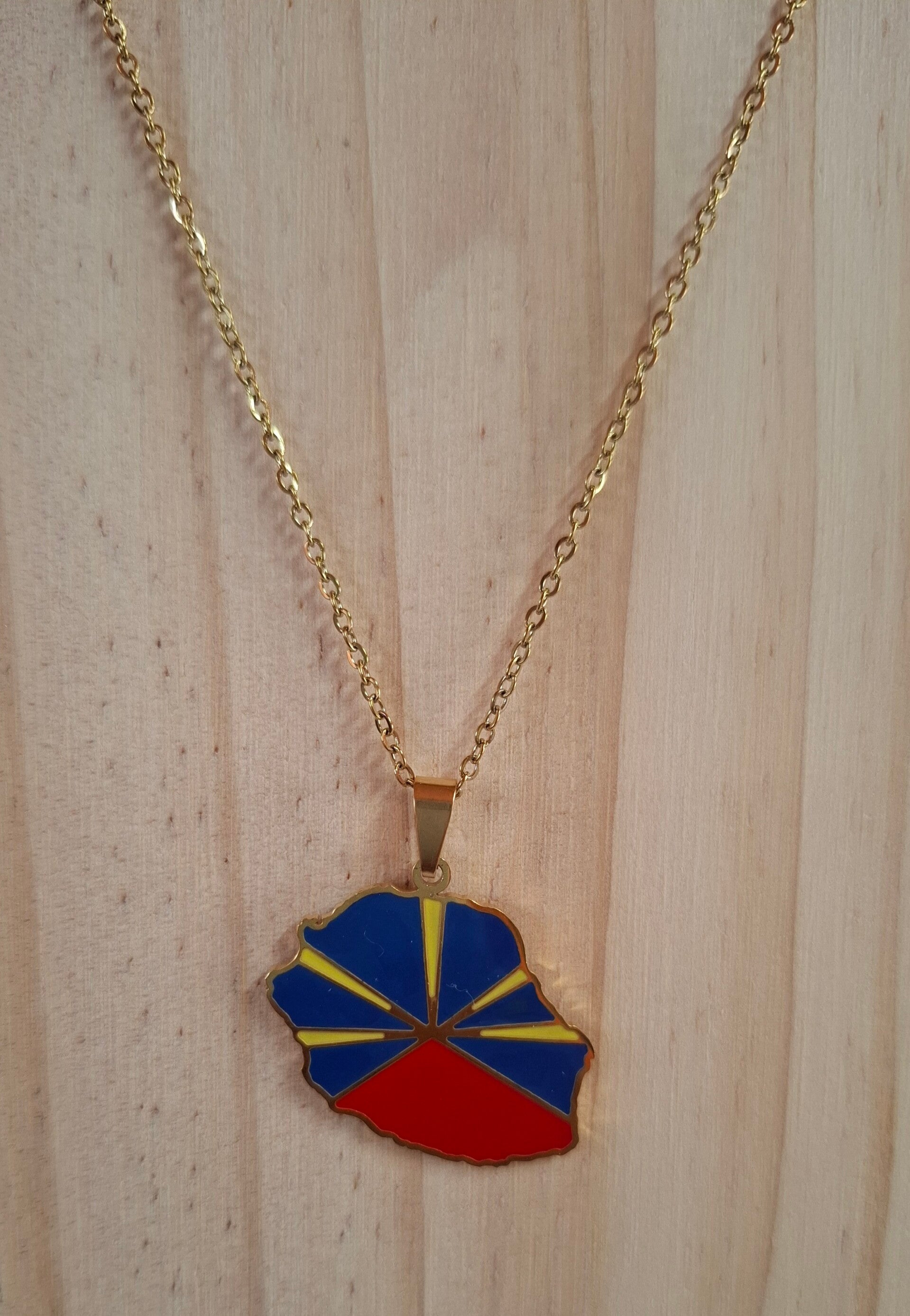Exprimez votre fierté pour l’île intense avec ce collier en acier inoxydable doré représentant la carte de La Réunion, décorée aux couleurs du drapeau réunionnais (bleu, jaune et rouge).